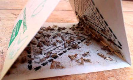 От взрослых бабочек можно избавиться, используя липкую ленту, секции от кухонной моли, или специальные феромонные ловушки.